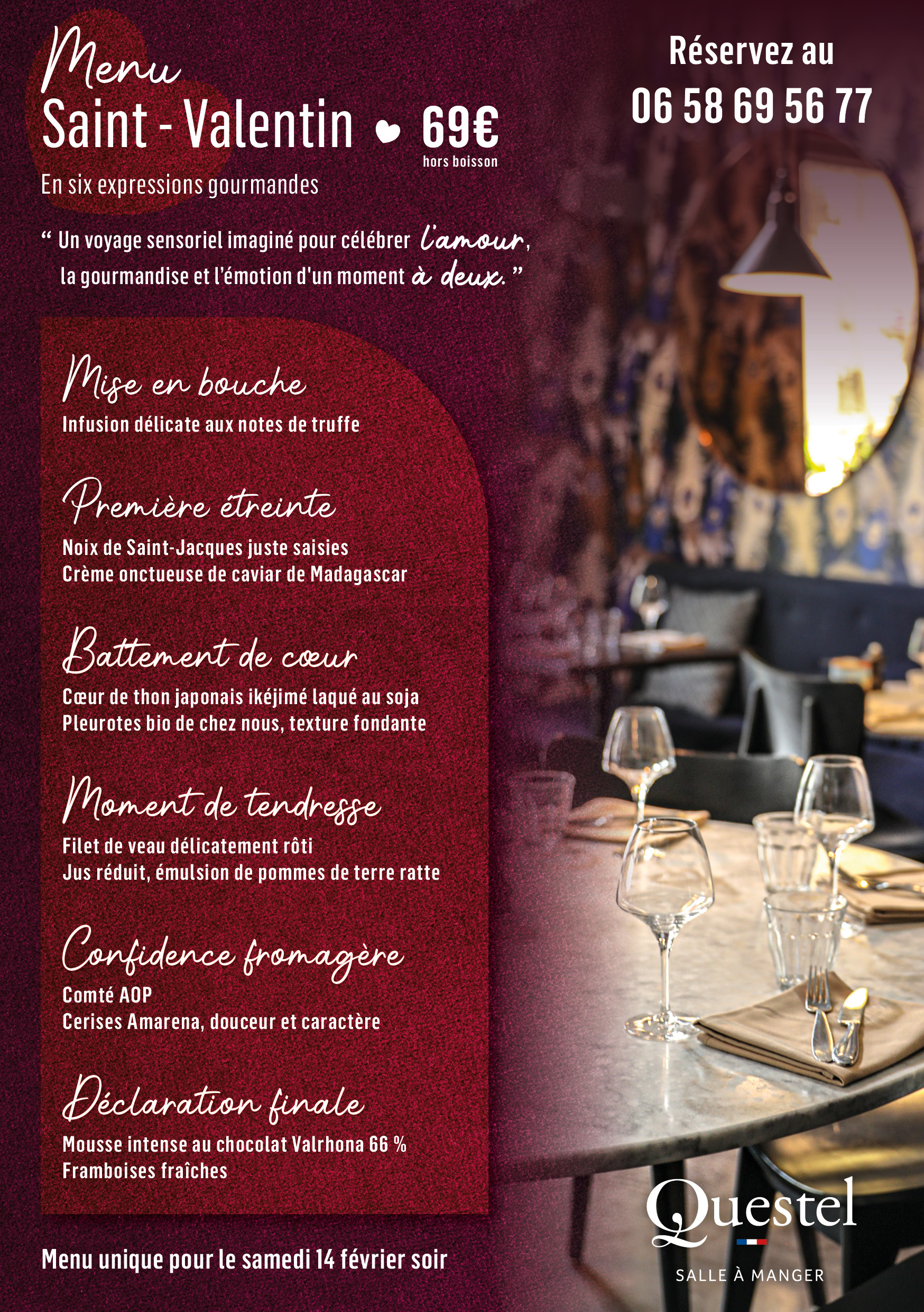 Le Questel, c’est une aventure extraordinaire et une équipe qui oeuvre pour vous offrir un véritable plaisir du palais. Chaleureux est la définition parfaite de cet établissement. Eva et Victoria sont aux petits soins des habitués comme des nouveaux clients. Découvrez ce lieu magique aux senteurs de saison et laissez-vous envouter par la chaleur humaine qui s’en dégage. Un merveilleux moment à partager…
